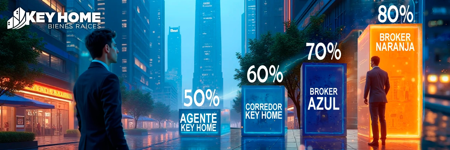 Agente Key Home al 50%. Y tiene la opción de subir a Corredor Key Home al 60 %.   Bróker Azul al 70%. Y Broker Naranja al 80%.  Las calificaciones a todos los niveles se basan en el número de operaciones inmobiliarias realizadas por el Agente o Corredor Inmobiliario Key Home en un cuatrimestre calendario.